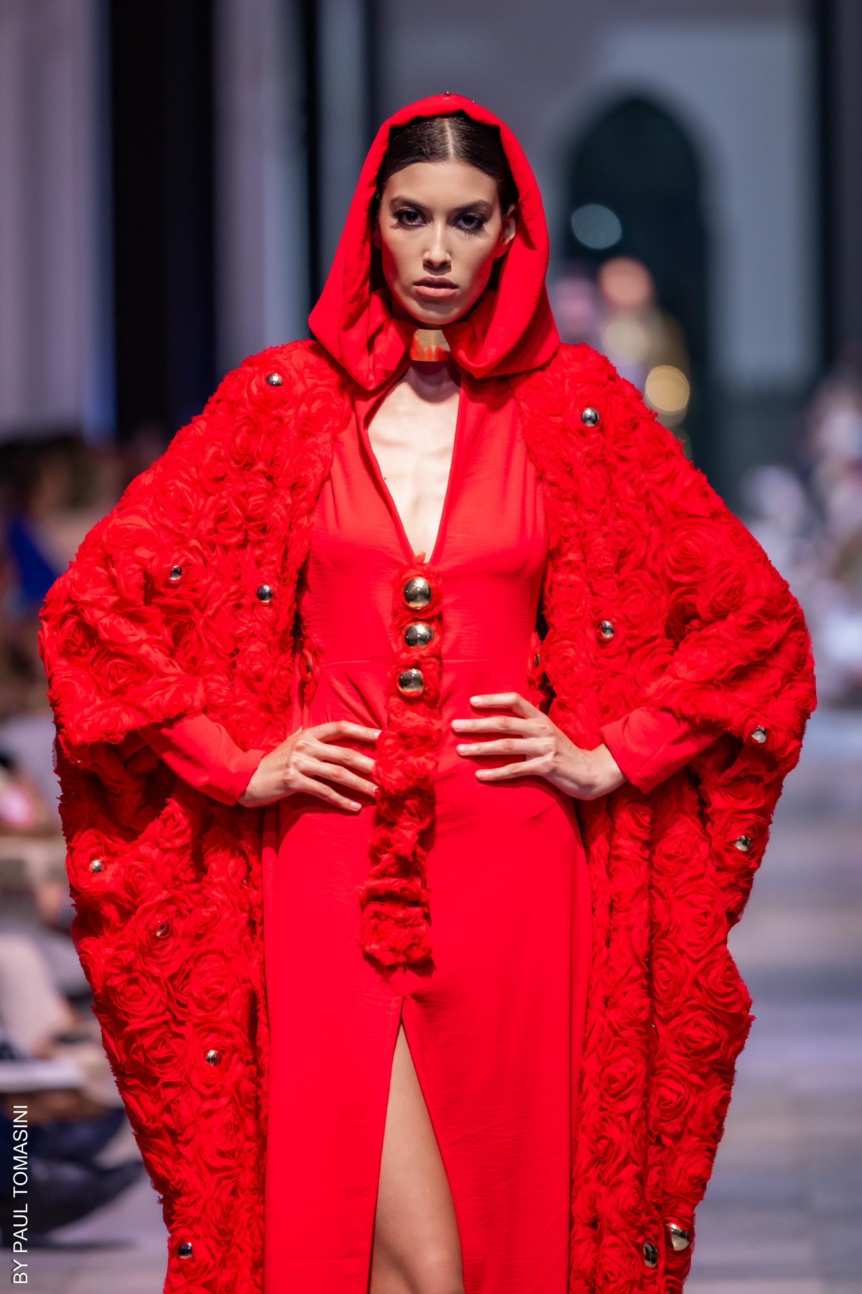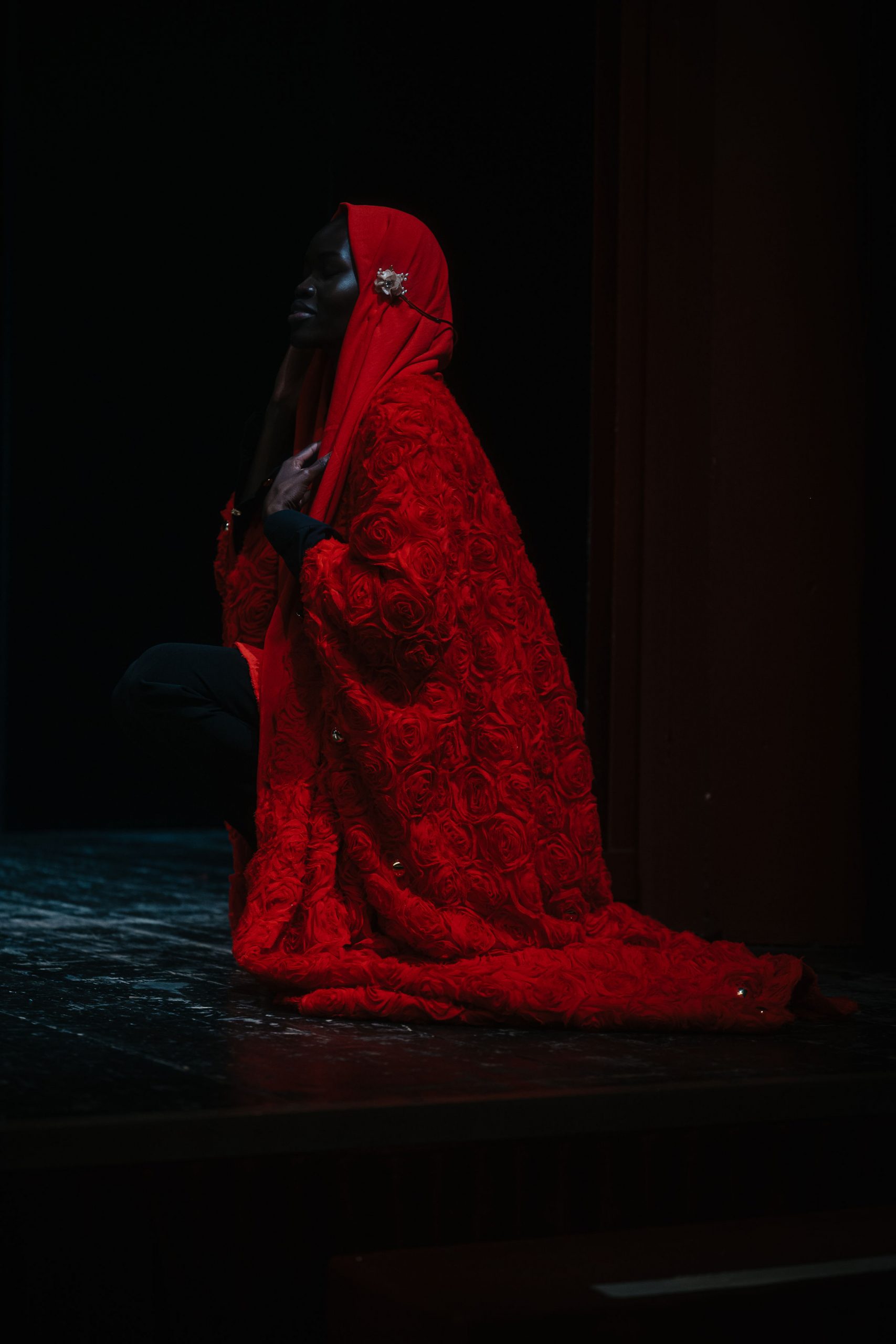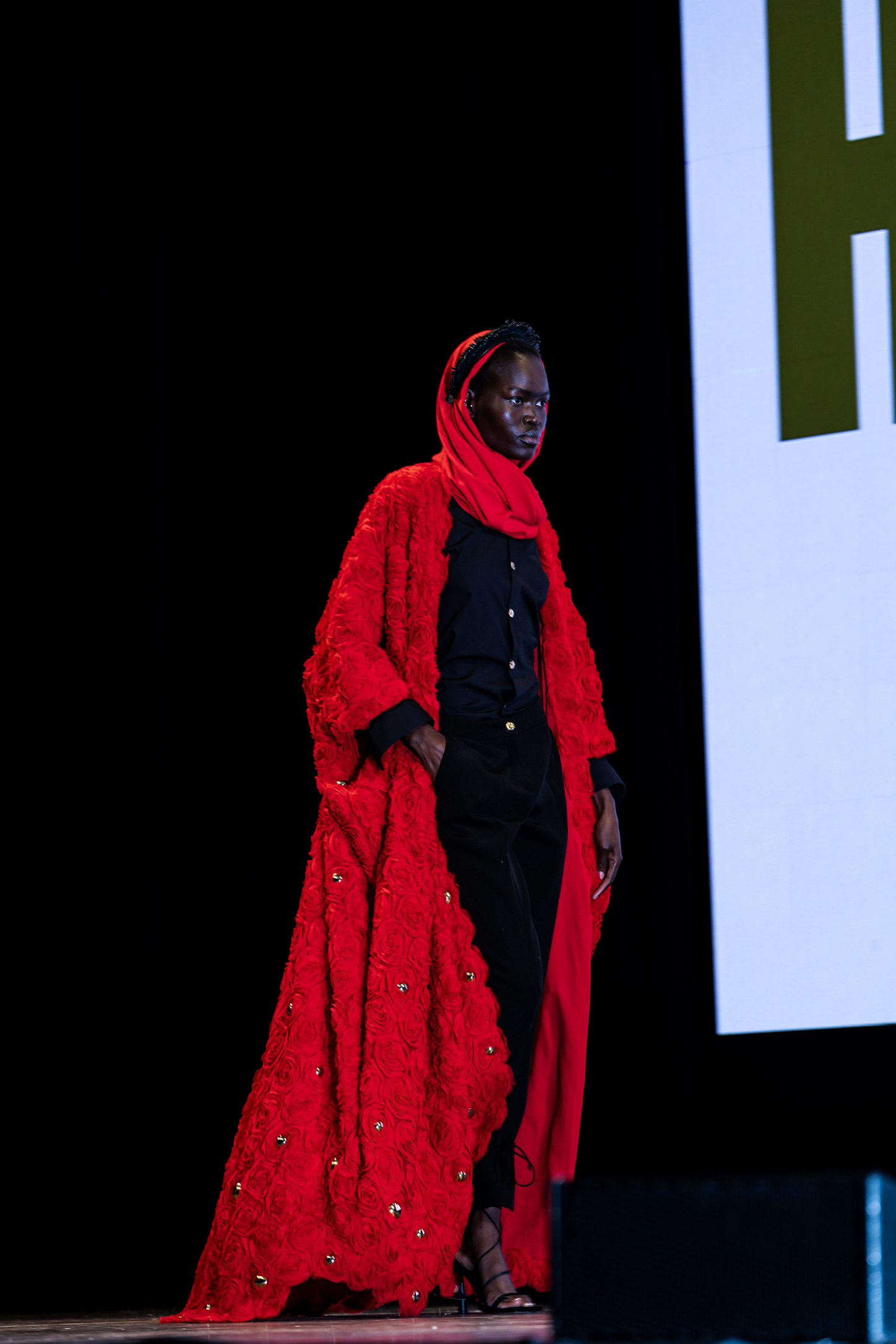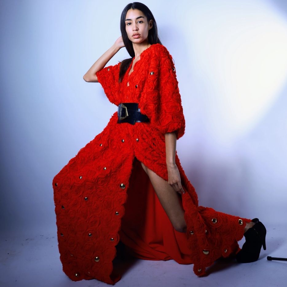 L’abaya è realizzato in un vibrante rosso scarlatto, caratterizzato da un motivo a rose tridimensionali in rilievo che ricopre l’intera superficie, conferendo volume e una texture romantica e materica.